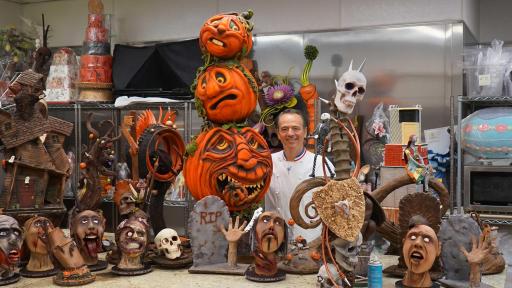 Combining the glitz and glamour of Sin City with a decrepit scene, a zombie showgirl is the main focal point at Bellagio. Standing alongside a rundown “Welcome to Las Vegas Sign” and in a mountain of rubble made from cookie and sugar pieces, she was created using nearly160 pounds of chocolate and 75 pounds of rolling fondant. Scary zombie heads, wicked jack-o’-lanterns and other intricate, holiday-inspired delights decorate every nook and corner in both European pastry shops, each creating complete Halloween scenes.