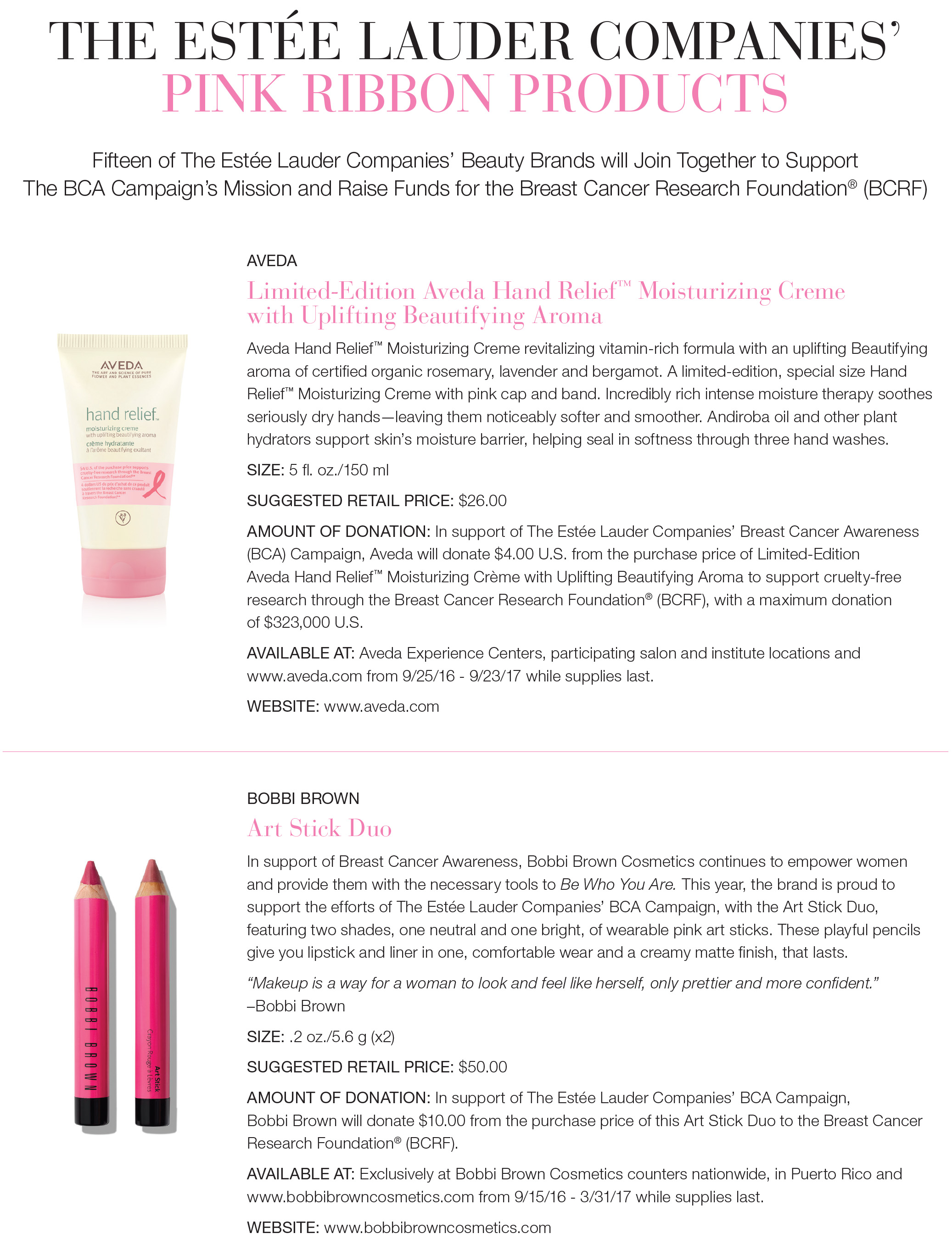 - Offer Pink Ribbon Products globally through many of The Estée Lauder Companies’ sought-after beauty brands to raise awareness and funds