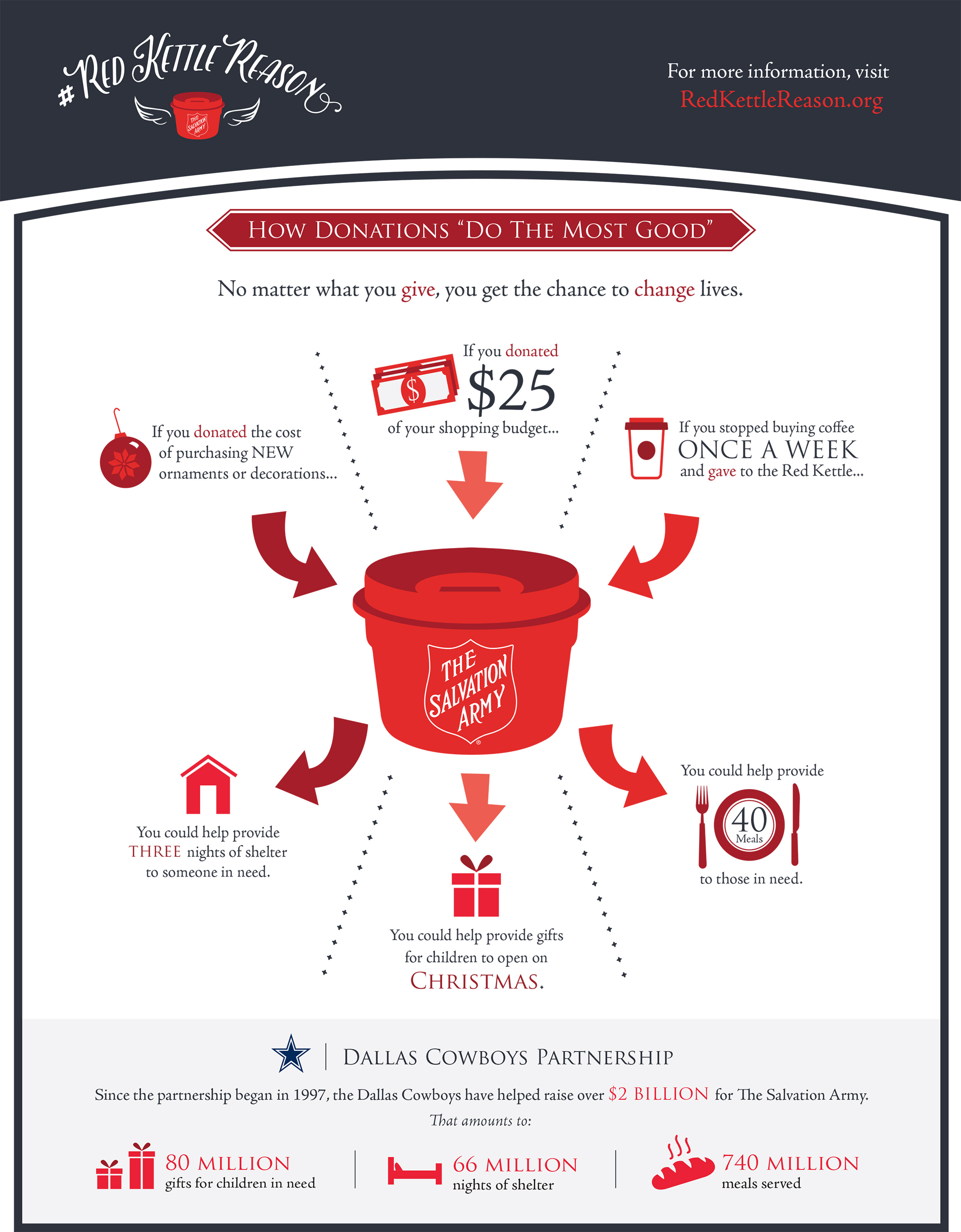 The Salvation Army continued its #RedKettleReason initiative, a movement fueled by America's motivations for donating to the red kettles. New this season, The Salvation Army called on Americans to start their own #RedKettleReason fundraisers, and offered the opportunity to designate their contributions to support cause areas that fight hunger, provide shelter or ensure Christmas assistance for those in need.