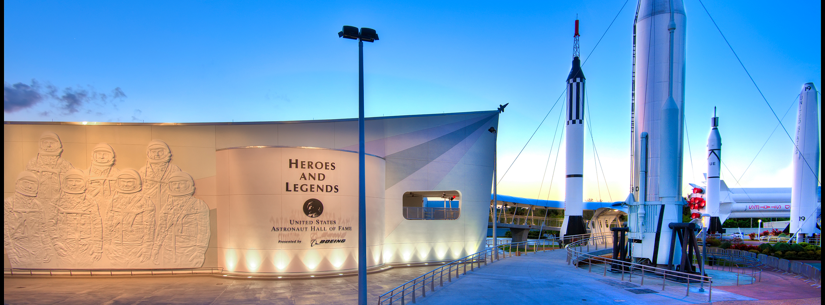 The deliberate architectural design for the new building is meant to celebrate spacecraft throughout history and into the future, and features a 30-by-40-foot bas-relief sculpture of the seven Mercury astronauts on its facade. A dramatic, sweeping ramp entrance simulates the journey to the stars, and features an elevated slingshot path through the Rocket Garden.