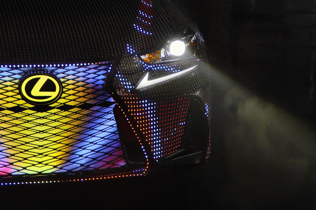 The custom car produces 175,000 lumens when fully illuminated, and the LED strips, if placed end-to-end, would stretch half a mile in length. Three distinct modes allow the LIT IS to interact with sounds and people in its vicinity. Attract mode features a loop of colorful graphics that highlight the strong lines of the IS and play into its bold styling. Music Viz mode is designed to respond to music, as the LEDs will create custom, responsive displays that perfectly sync to any song. Gesture mode allows the motion of the LED animations to be controlled by users’ hand movements with the help of a gaming console. This mode directly connects the car and the driver, allowing the person to send a signal and see the car respond.