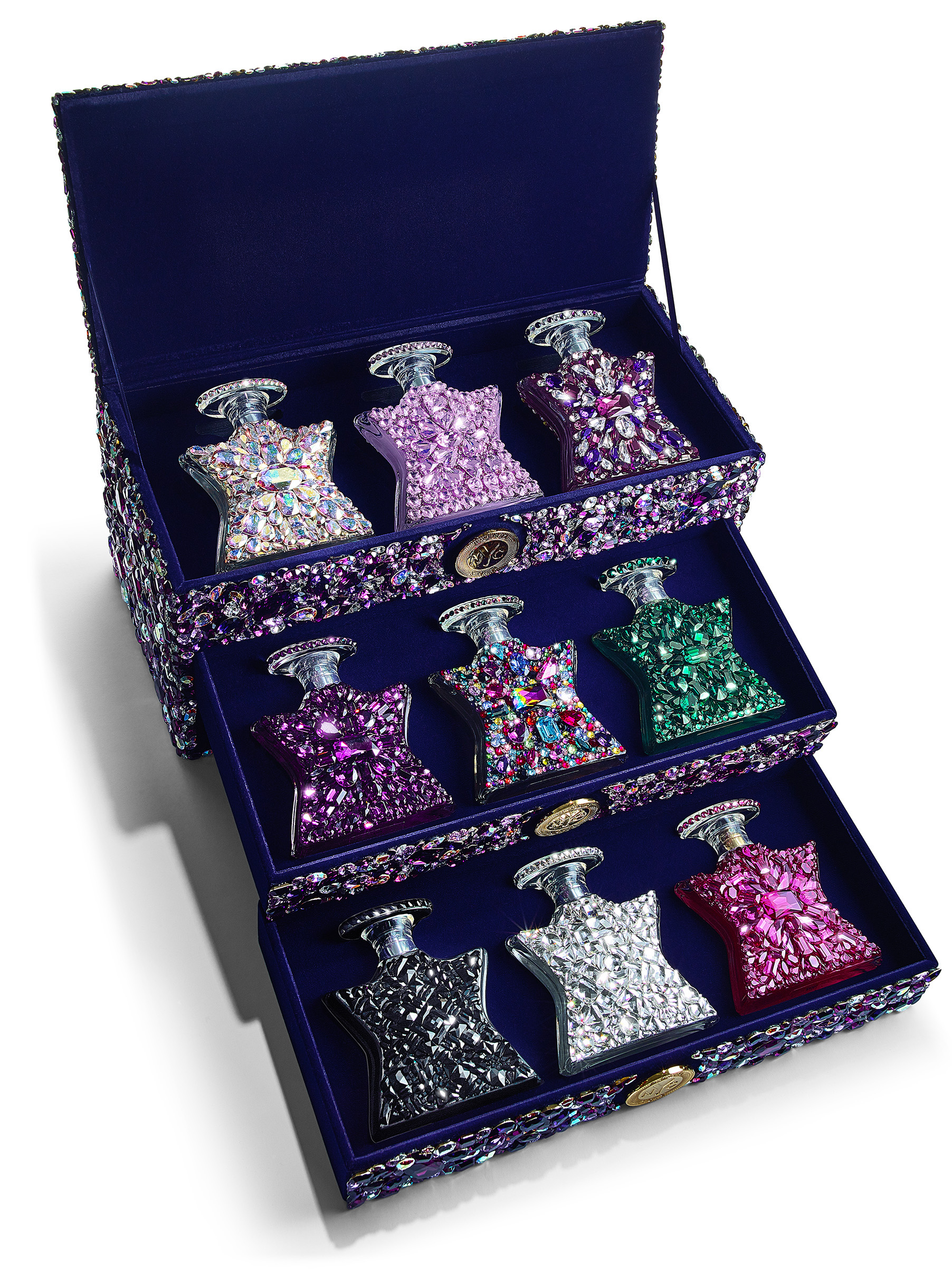 BOND NO. 9 STAR-STUDDED SWAROVSKI GALACTIC COFFRET: an outrageously sumptuous triple-tier bijoux keepsake box, covered with 4,000 hand-applied Swarovski Fancy Stones of vivacious gem colors. They’re a mix of cabochons, hearts, aqualines, teardrops, et al. Lined in deep-space silk velvet, it contains 9 of our most sought-after eaux de parfum, each in a (refillable) 100 ml bottle decked with its own unique kaleidoscope of Swarovski crystals.
