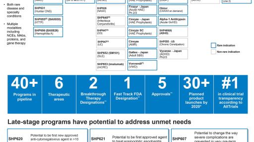 “Over the last three years, Shire’s sharp focus has helped us build an industry leading rare disease pipeline,” said Flemming Ornskov, M.D., M.P.H., Chief Executive Officer. “Our pipeline, which is the most robust in Shire’s history, includes more than 40 clinical programs, over 50% of which are in registration or Phase 3, and 70% of which are in rare diseases. We focus on delivering first- and best- in-class medicines to address significant unmet need for patients around the world to achieve maximum impact.”