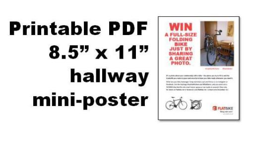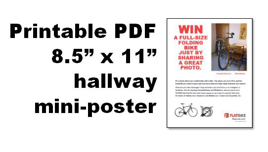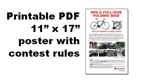 - Eligibility: Open to United States submitters only. Enter by following @flatbike on Instagram and tagging a photo #mybikefitshere and #flatbikeinc. Entries from Twitter and our Facebook wall (facebook.com/flatbike.net) containing the same two hashtags are also welcome. Photo must be your original work, posted by December 2, 2016. You are allowed to enter multiple photos into the contest. All entered photos will have shared copyright ownership between the submitter and Flatbike, Inc.