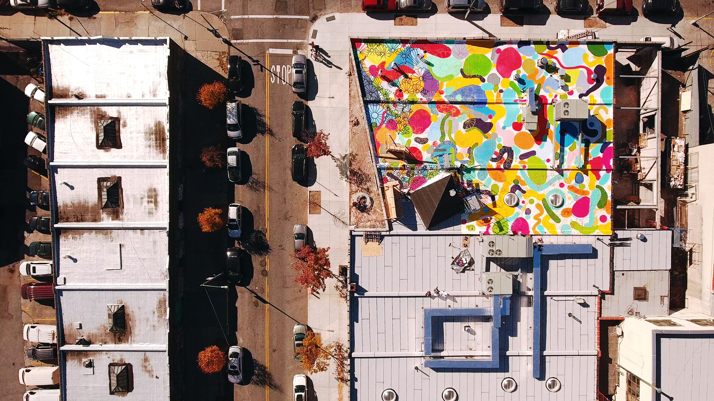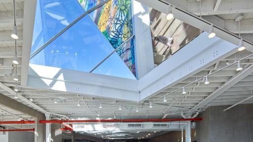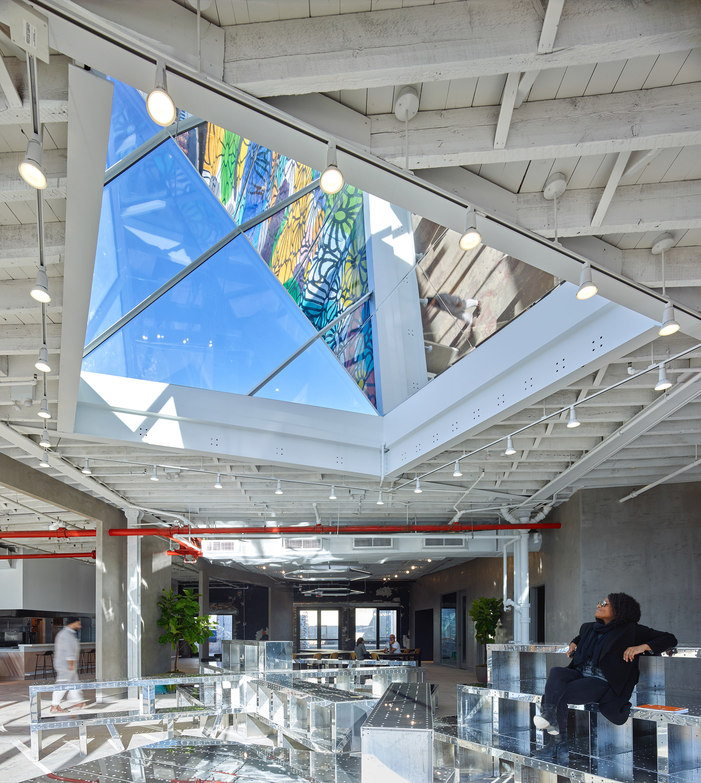 While carefully preserving elements of the existing structure at 29 Norman Ave, the layout of A/D/O carves out a variety of unique spaces for creative work. Realized by Brooklyn-based nARCHITECTS, the building offers generous, open space as well as quiet breakout rooms, designed for intersections between the various programs within A/D/O. Permanent design elements such as the 16-foot-tall mirrored “periscope” skylight are meant to complement pieces introduced by guest artists and designers in residence –– starting with a rooftop mural by Brooklyn-based artist Mike Perry –– and to inspire them to use the space as a canvas.