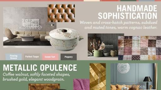 - Handmade Sophistication: Geo-quilt patterns, deep earthy colors and metal accents align at the intersection of homemade and high-end chic with this welcoming aesthetic. To create a feeling of laid-back sophistication, this trend balances the rough edges of exposed beams and concrete slab floors with cognac leather and dark pewter finishes. Whether an accent doorknob or a coffee-toned media stand with an industrial frame, the opportunities to incorporate this trend are endless and allow for a look that is both affluent and authentic.