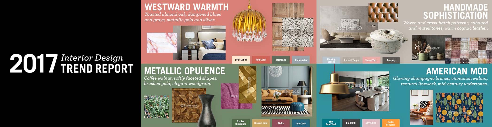 - Metallic Opulence: Influenced by the Art Deco era, this trend melds one luxurious element after another to deliver a combination of comfort and high-end design. Strong, geometric patterns and dark hues complement softly faceted shapes, matte black accessories and brushed gold finishes. Conversely, metallic accents are balanced with soft textiles in natural greens, strong blues and rosy purples. Coffee and walnut tones juxtapose stone accents for an added touch of elegance to this opulent yet livable design.