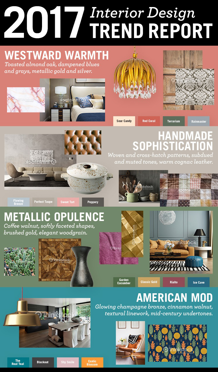 - Metallic Opulence: Influenced by the Art Deco era, this trend melds one luxurious element after another to deliver a combination of comfort and high-end design. Strong, geometric patterns and dark hues complement softly faceted shapes, matte black accessories and brushed gold finishes. Conversely, metallic accents are balanced with soft textiles in natural greens, strong blues and rosy purples. Coffee and walnut tones juxtapose stone accents for an added touch of elegance to this opulent yet livable design.
