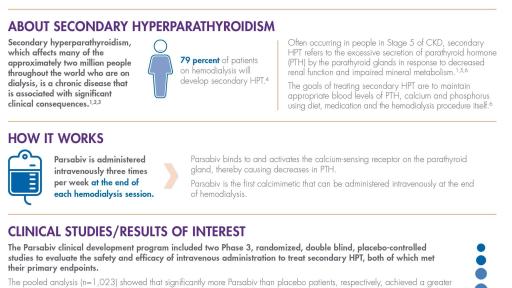 Secondary HPT is a serious condition and the proportion of patients unable to reach recommended secondary HPT lab targets has more than doubled in the last five years. Sensipar® (cinacalcet), the first FDA-approved calcimimetic, became an important treatment for patients with secondary HPT on dialysis based on its ability to reduce three important biochemical abnormalities (PTH, calcium, phosphorus). Parsabiv is a novel calcimimetic that can be delivered intravenously at the end the hemodialysis session and has been demonstrated to effectively reduce levels of PTH, corrected calcium and phosphate. These reductions were maintained for up to 78 weeks.