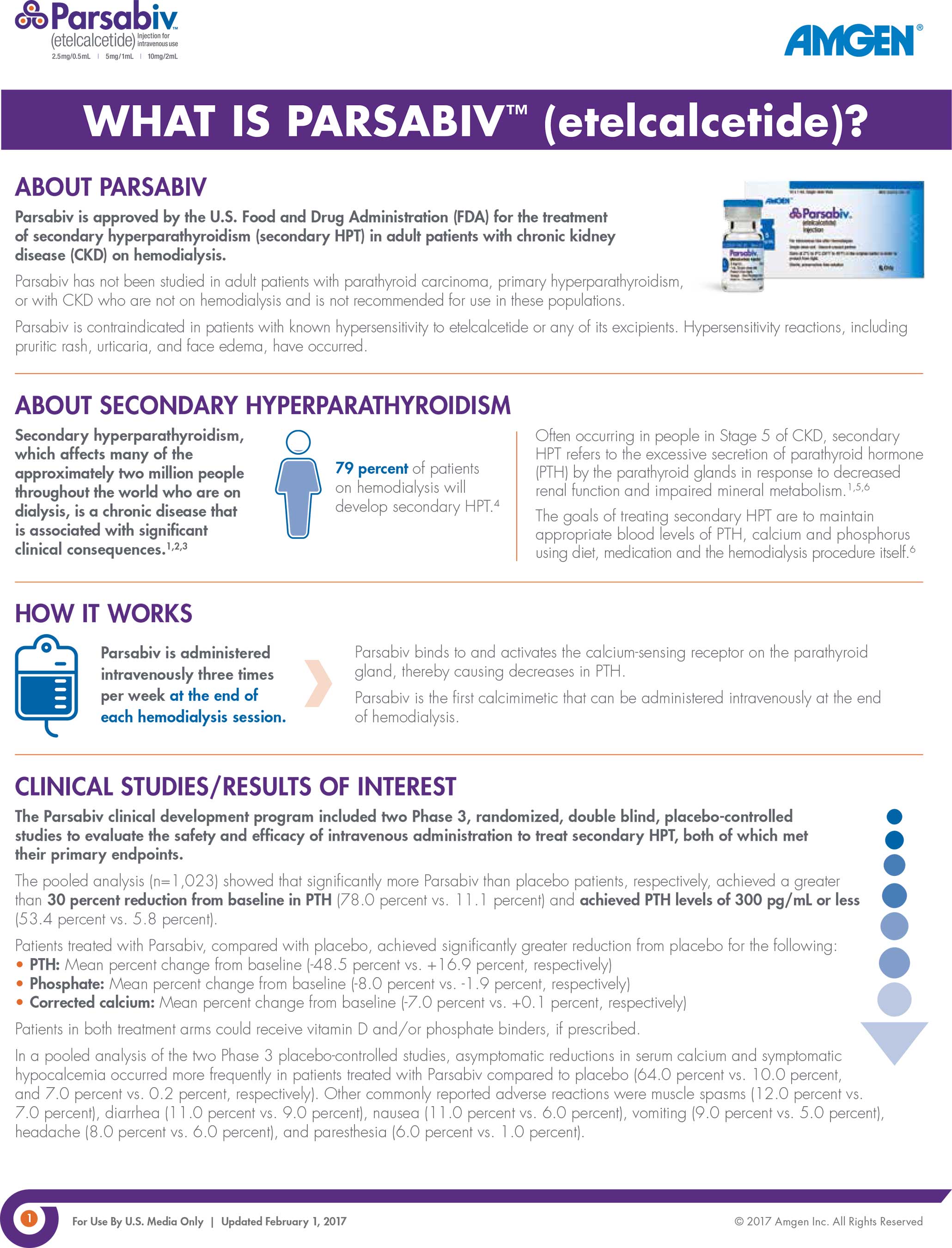 THOUSAND OAKS, Calif. (Feb. 7, 2017) – Amgen (NASDAQ:AMGN) today announced that the U.S. Food and Drug Administration (FDA) has approved Parsabiv™ (etelcalcetide) for the treatment of secondary hyperparathyroidism (HPT) in adult patients with chronic kidney disease (CKD) on hemodialysis. Parsabiv is the first therapy approved for this condition in 12 years and the only calcimimetic that can be administered intravenously by the dialysis health care team three times a week at the end of the hemodialysis session.