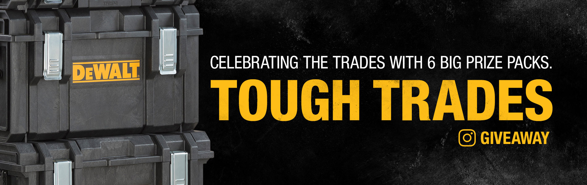 DEWALT Tough Trades Sweepstakes: NO PURCHASE NECESSARY TO ENTER OR WIN. See Official Rules for the entry period of each Sweepstakes. You must be age 18+ and legal resident of USA (50 states or D.C.) to enter. Employees (and their immediate families and members of same household, related or not) of DEWALT and its affiliates are not eligible to enter. Each Sweepstakes will award 1 prize to 1 winner. Odds of winning a prize depend on the number of eligible entries received for each Sweepstakes. All federal, state and local laws and regulations apply. Void where prohibited.