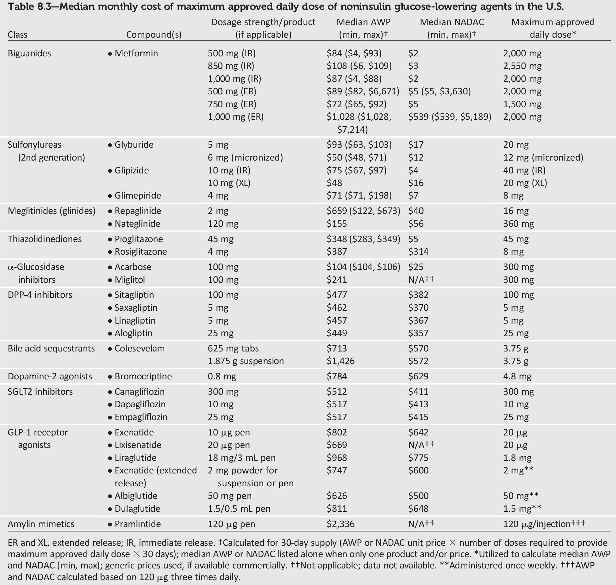 Table 8.3 - Median monthly cost of maximum approved daily dose of noninsulin glucose-lowering agents in the U.S.