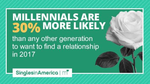 Dating Apocalypse? Think again. Millennials are 30% more likely than any other generation to want to find a relationship in 2017—and they are using technology to do it. They are 75% more likely than Boomers to have dated someone online, and 57% more likely than those of other generations to have created a profile on a dating app.
