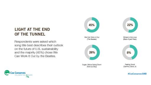 While many fear that sustainable practices in the country are in jeopardy, they are also hopeful based on the improvements they’ve made within their respective organizations. The survey found that 72 percent of respondents think we should participate in the Paris Climate Agreement. While an overwhelming majority (76 percent) believe in climate warming, female SMB owners tend to index higher than men in this area (81 percent versus 67 percent). When asked to select a song that best describes the nation’s current state of sustainability, the majority of SMBs selected We Can Work It Out by the Beatles.