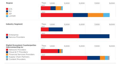 According to the second annual Global Interconnection Index (the “GXI”), a market study published by Equinix that analyzes traffic exchange globally, Interconnection, or direct and private traffic exchange between key business partners, is becoming the defacto method for companies to operate in today’s digital world. Interconnection Bandwidth provisioned for this purpose is forecasted to grow by 2021 to 8,200+ Terabits per second (Tbps) of capacity, or the equivalent of 33 Zettabytes (ZB) of data exchange per year, a dramatic increase over the previous year’s projection and ten times the projected capacity of internet traffic1. This represents a significant five-year compound annual growth rate (CAGR) of 48%, almost double the expected 26% CAGR of global IP Traffic.