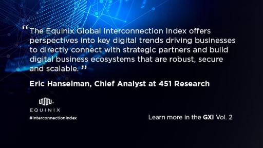 “As enterprises chart their paths to greater digitization, they seek pathways that avoid the turbulence generated by the growing complexity of integrating various digital services. New architectures anchored by Interconnection smooth this complexity and, increasingly, enterprises are finding that they also yield improvements in security, performance and capacity. Equinix’s Global Interconnection Index provides useful insight into these digital trends including why businesses are directly connecting with strategic partners to build their digital business ecosystems.”