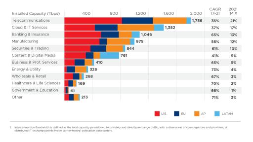 - The GXI also forecasts Interconnection Bandwidth growth by counterparty categories, estimating the Interconnection behavior of each. Surpassing all other categories, Interconnection between Enterprises and Cloud and IT Providers is projected to grow 98% per annum through 2021, supporting businesses building out new digital services and migrating existing workloads to third-party cloud platforms.