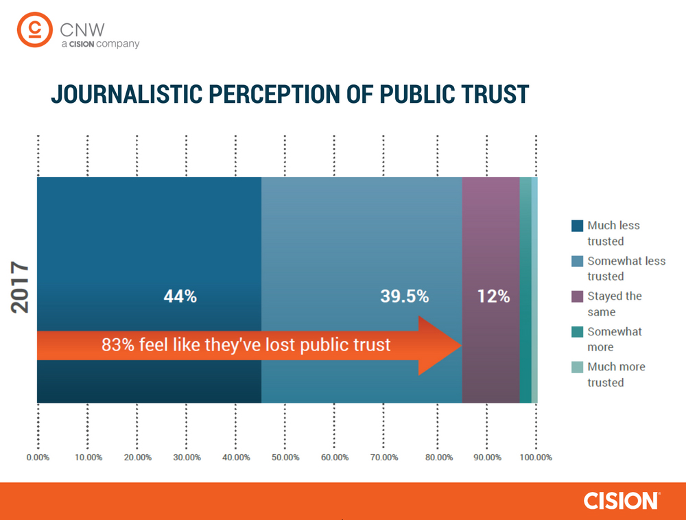 - Journalists are also less trusting – of social media. Despite using social media more frequently, only 44 percent of journalists feel that social media is a reliable source of information, down seven per cent from 2016.