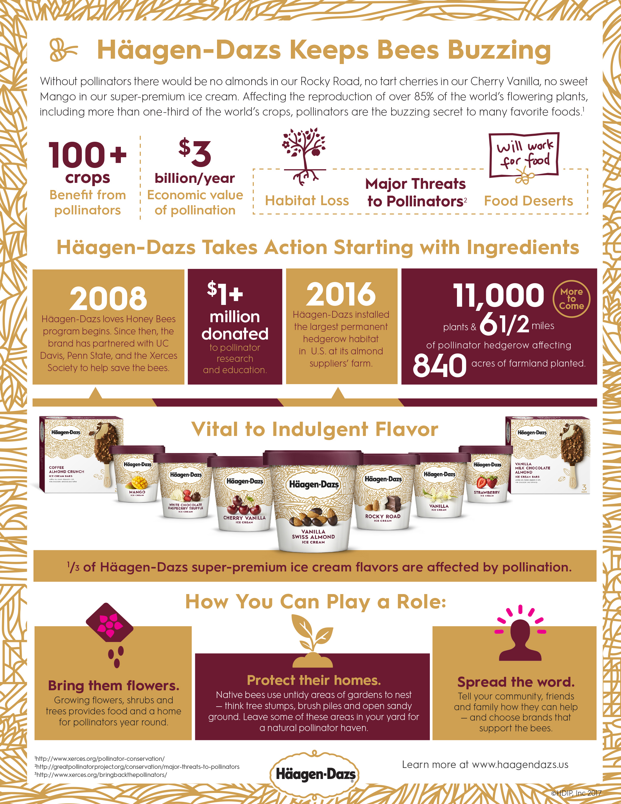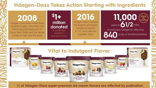 Since 2008, the Häagen-Dazs brand has donated more than $1 million to support honey bee research and education through its partners, U.C. Davis, Penn State and the Xerces Society. The Häagen-Dazs brand encourages everyone to create more bee-friendly habitats throughout the country by planting region-specific wildflowers.