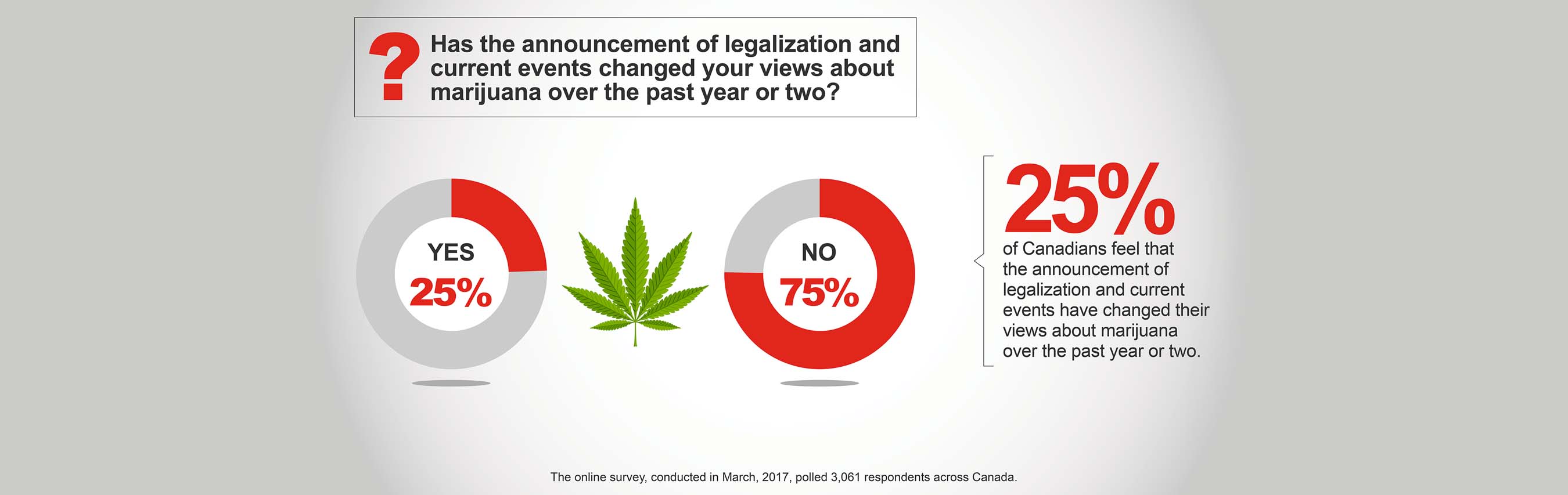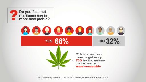 Generally, the path toward legalization seems to be changing how Canadians feel about marijuana, largely in a more accepting way. One out of 4 survey respondents say that their views on marijuana have changed since Prime Minister Trudeau announced his promise to legalize marijuana. And of those whose views have changed, nearly 70% feel that marijuana use has become more acceptable.