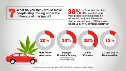 - 38% believe that stiffer penalties would discourage people the most from driving while high. This is closely followed by stronger road side testing (30 per cent) which jumped up by 11 per cent when compared to the 2016 survey