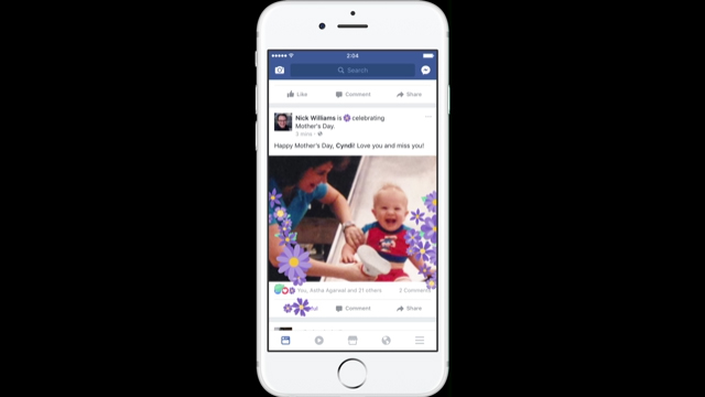 Jazz Up Your Photos: In Facebook Camera, you can find some new colorful, Mother's Day-themed masks and frames. If you swipe right on News Feed, go to the effects tray and you'll be able to find the effects in the mask and frame category.