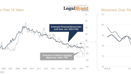 “While there are reasons to be optimistic about the U.S. economy, since December there has been a divergence of ‘soft data’ based on consumer and business confidence surveys, and ‘hard data’ based on actual market events, such as demand for legal services,” Jeff Bell, LegalShield CEO, said. “Historically, when the LegalShield Consumer Financial Stress Index drifts away from the Consumer Confidence Index, it is typically consumer confidence that falls back into line with our index, not the other way around. We saw this in 2006 and 2007, when our index provided an early warning signal of the drop-off in confidence at the outset of the Great Recession.”