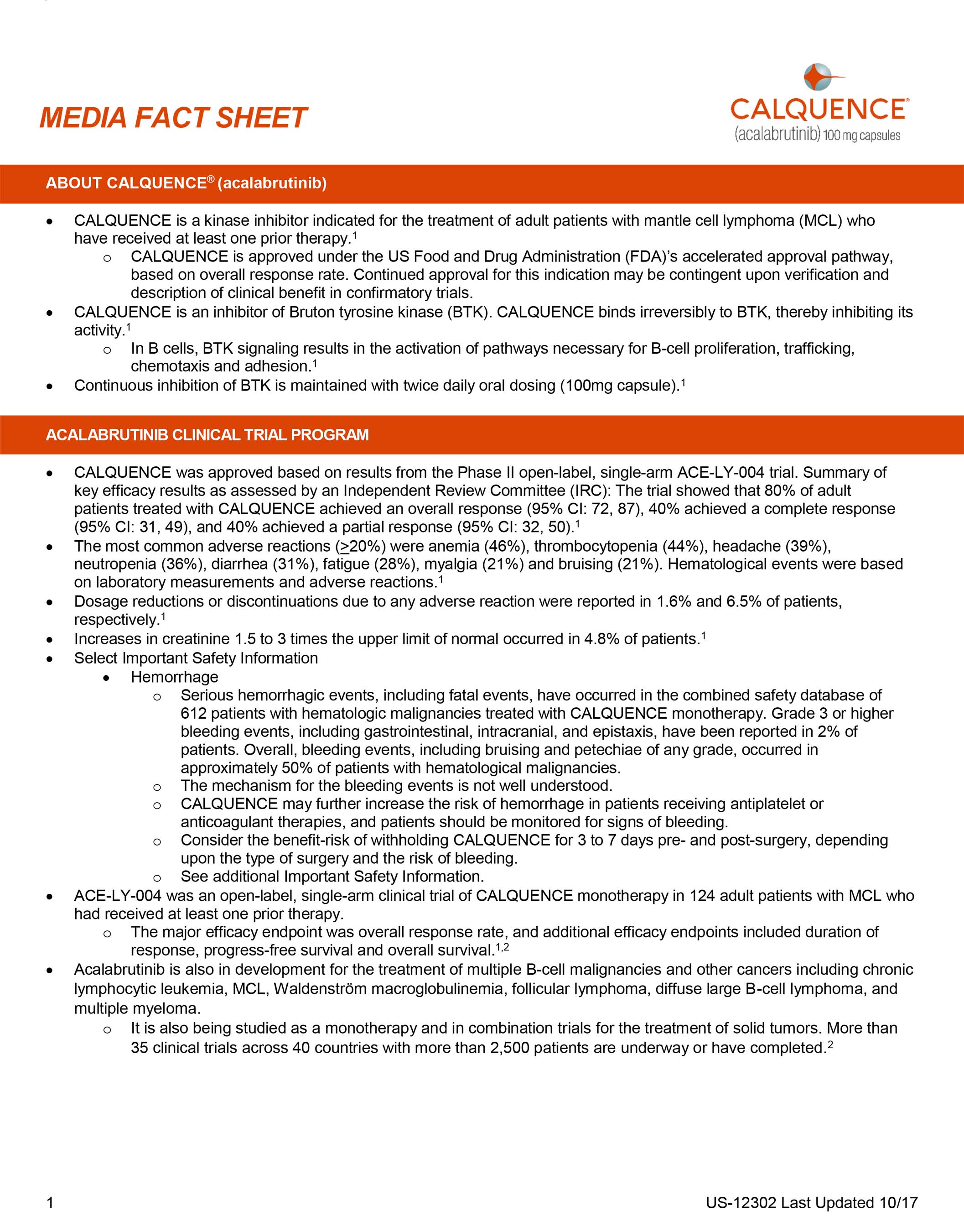 (WILMINGTON, Del., October 31, 2017) – AstraZeneca and its hematology research and development center of excellence, Acerta Pharma, today announced that the US Food and Drug Administration (FDA) has granted accelerated approval to CALQUENCE® (acalabrutinib). CALQUENCE is a kinase inhibitor indicated for the treatment of adult patients with mantle cell lymphoma (MCL) who have received at least one prior therapy.1