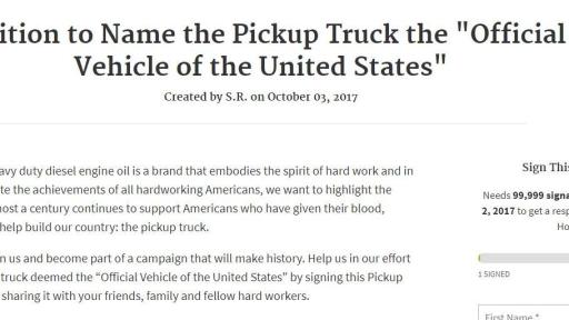 As of today, the petition is live and can be signed and shared on https://petitions.whitehouse.gov/petition/petition-name-pickup-truck-official-vehicle-united-states. Once 100,000 signatures are collected and submitted, the government will read the petition and either move forward with the proposal or offer a response. Please join the Shell ROTELLA® campaign to honor the pickup truck by signing the petition to help reach 100,000 signatures to ensure the White House responds to the petition.