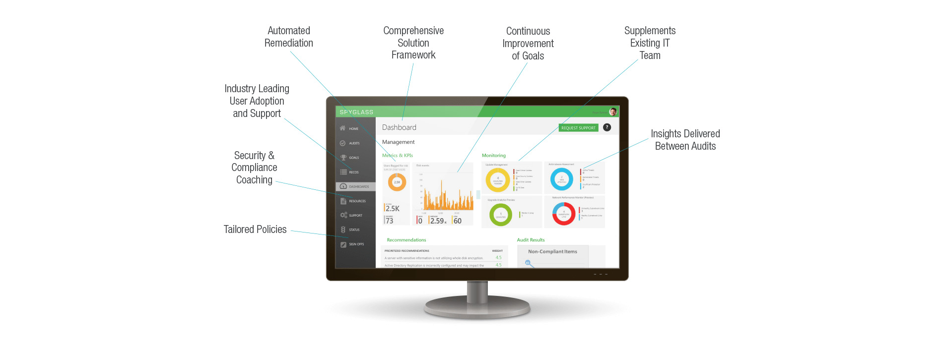 From day one, a dedicated security coach closely monitors and analyzes Spyglass customers’ performance reports, constantly searching for ways to improve their cybersecurity practice. Spyglass’ ongoing support model also grants flexible access to Catapult’s full breadth of managed services, giving Spyglass customers the freedom to leverage IT expertise on demand.