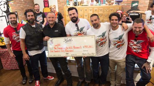 Kiehl’s President Chris Salgardo and amfAR CEO Kevin Robert Frost led the 1,200 mile, 8-day journey, accompanied by actors Tyler Posey, Gilles Marini and Ian Bohen, tattoo artist Luke Wessman, and TV hosts Anthony Carrino and Grant Reynolds. Over eight days, the riders participated in nine public events, meeting customers and educating about HIV/AIDS research.