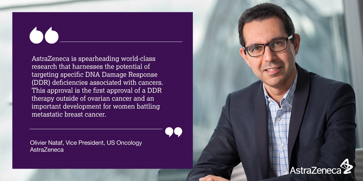 Dave Fredrickson, Executive Vice President, Head of the Oncology Business Unit, AstraZeneca, said: “This new approval for LYNPARZA makes it the first and only PARP inhibitor approved in metastatic breast cancer, and the only PARP inhibitor approved beyond ovarian cancer. This is significant for breast cancer patients, as the identification of BRCA status, in addition to hormone receptor and HER2 status, becomes a potentially critical step in the management of their disease.”