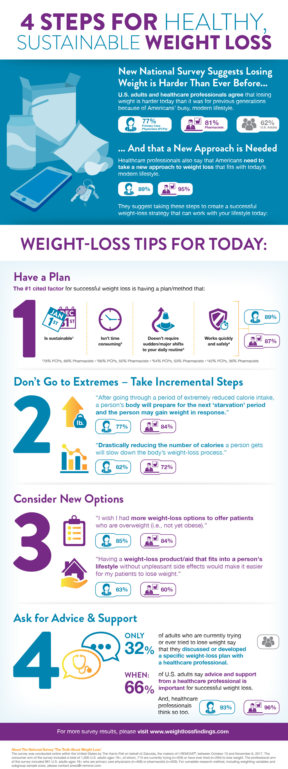 Specifically, most healthcare professionals and a majority of U.S. adults say losing weight is harder today than it was for previous generations because of the busy, modern lifestyle of Americans (77% of primary care physicians or PCPs, 81% of pharmacists, 62% U.S. adults). In fact, approximately seven in 10 healthcare professionals say it’s harder for Americans today to lose weight compared to just 10 years ago (69% of PCPs, 73% of pharmacists), and the vast majority believe Americans need to take a new approach to weight loss that fits with today’s modern lifestyle (89% of PCPs, 95% of pharmacists).