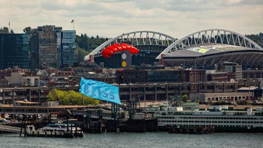 In celebration of Norwegian Bliss’ christening, skydivers descend over the ship in Seattle, Washington