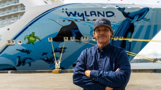 Renowned marine life artist and conservationist, Wyland, in front of his hull art on Norwegian Bliss