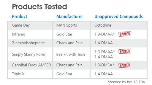 Based on the study findings, the researchers are encouraging consumers to avoid products that are labeled as containing “2-aminoisoheptane” or Aconitum kusnezoffii. The study found the following pre-workout and weight-loss products contain potentially harmful quantities of illegal or unapproved dietary ingredients: