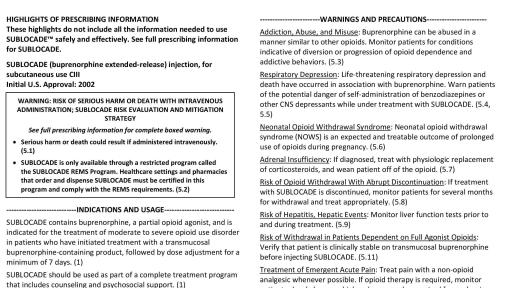 The full prescribing information, including BOXED WARNING, for SUBLOCADE can be found here: http://indivior.com/wp-content/uploads/2017/11/SUBLOCADE-Prescribing-Information.pdf.