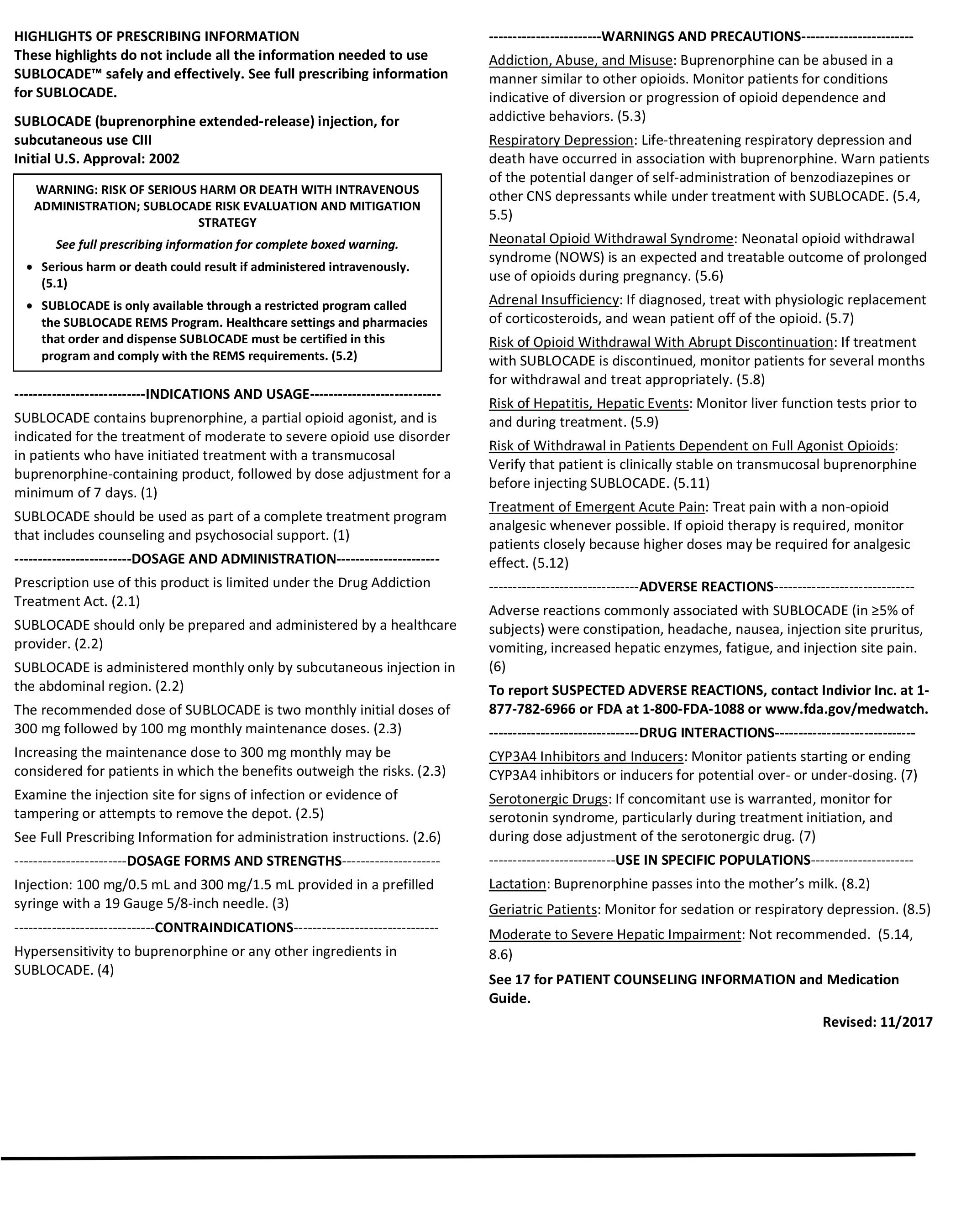 The full prescribing information, including BOXED WARNING, for SUBLOCADE can be found here: http://indivior.com/wp-content/uploads/2017/11/SUBLOCADE-Prescribing-Information.pdf.
