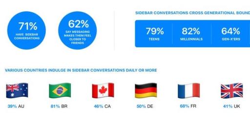 - Most people admit to sidebar conversations: Most people (71 percent) have sidebar conversations, and 62 percent of those that do say messaging makes them feel closer to friends (versus 36 percent of those who don’t sidebar)