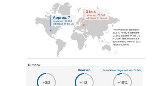 DLBCL is the most common form of non-Hodgkin lymphoma, a cancer of the lymphatic system, with an estimated 27,650 new cases diagnosed in 20165,6. Ten to 15% of DLBCL patients fail to respond to initial therapy or relapse within three months of treatment, and an additional 20% to 25% relapse after initial response to therapy5. Nearly 40% of patients with DLBCL will die of relapsed or refractory disease7.