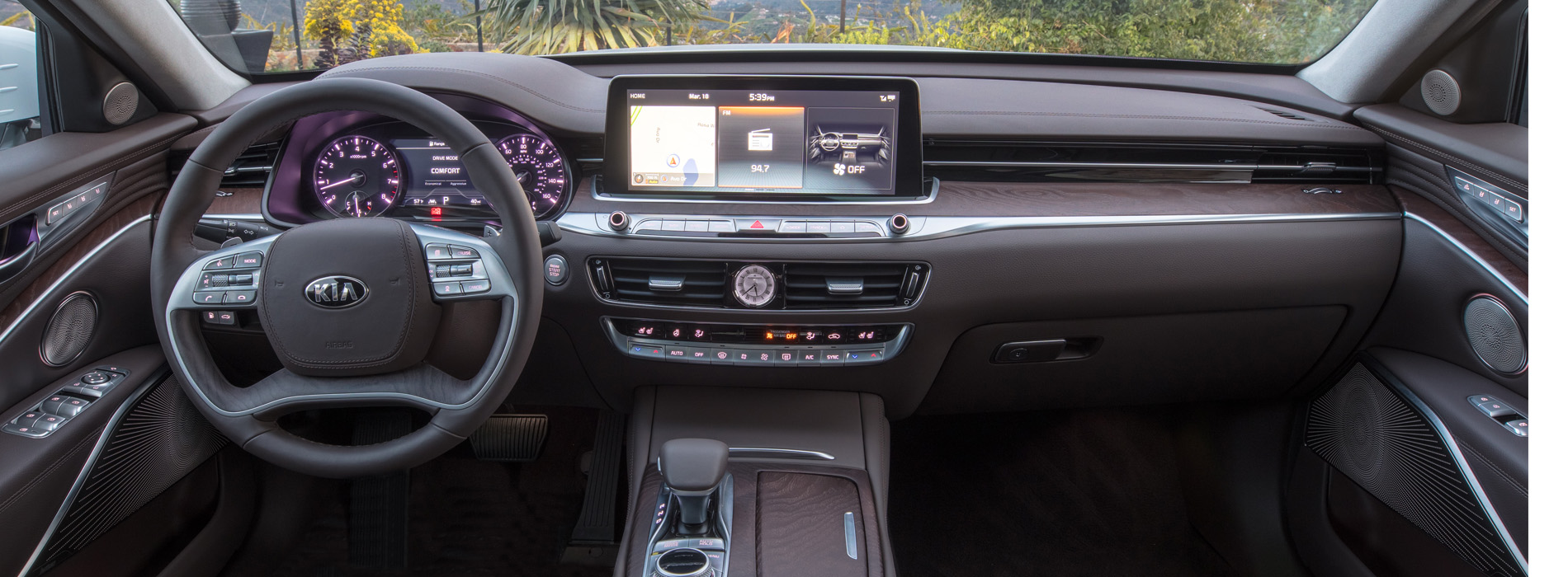 Elegant by design but with a minimalist layout, the interior of the new K900 provides drivers and passengers with a peaceful retreat that is simple, modern and comfortable. The cabin wraps around the driver, enhancing the sense of being cocooned from the outside world. A tight and virtually uninterrupted line between the doors and the instrument panel creates a deliberate sense of continuity. Flowing from the center of the dash and outward to the doors, surfaces are trimmed in a sophisticated combination of materials, with metal veneers and a choice of four open pore matte wood selections – Walnut, Brown Olive Ash, Beige Olive Ash and Engineered Wood. Soft leather balances the cabin’s harder natural surfaces in Black, Beige, Espresso Brown or two-tone Sienna Brown.
