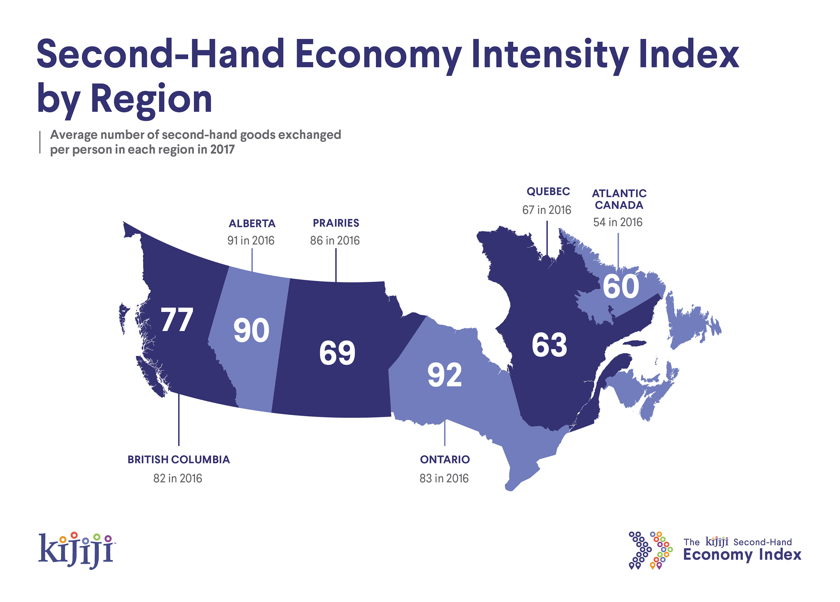 - People in Ontario traded the most items per person on average (92), measured as the “Intensity Index,” followed by Alberta (90), which was #1 in 2016, B.C. (77), the Prairies (69), Quebec (63) and Atlantic Canada (60).