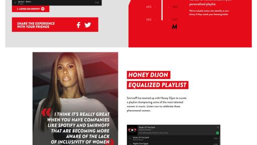 “We developed the Smirnoff Equalizer in partnership with Spotify because we believe that when we get to discover talented women artists and their phenomenal music, we’ll all have a better listening experience,” said Neil Shah, SMIRNOFF Global Senior Brand Manager. “The Smirnoff Equalizer not only drives awareness, but also allows Spotify users to take direct action by increasing the number of tracks from women artists in their playlists.”