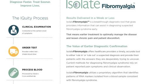 Providers who suspect fibromyalgia in a patient can order the test at IQuityLabs.com, with results delivered back to the provider within seven days of receiving the sample in the laboratory — reducing by months and even years the time it currently takes to diagnose the disease.
