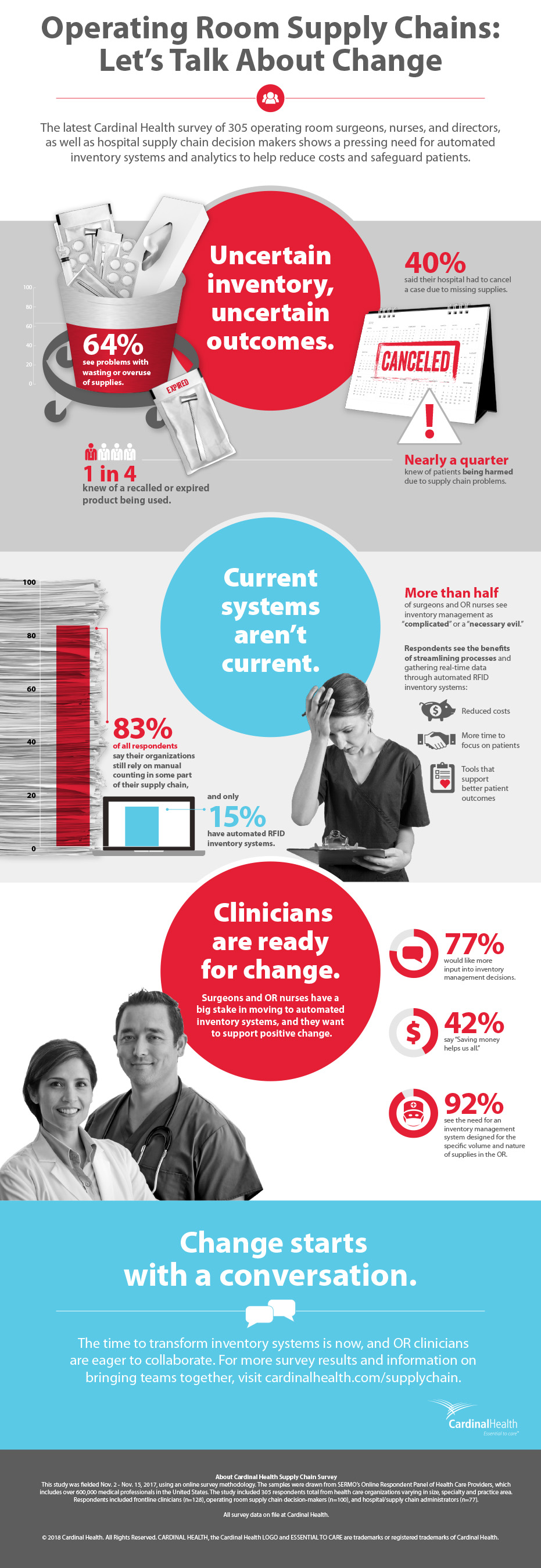DUBLIN, Ohio – March 28, 2018 — The operating room (OR) needs better supply chain management systems and analytics to help reduce costs and support patient safety, according to a new Cardinal Health survey of surgical staff and hospital supply chain decision-makers.