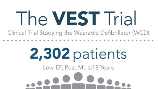 The VEST Trial studied use of the LifeVest WCD for patients who had recently suffered a heart attack (clinically known as a myocardial infarction or “MI”) and had a reduced heart function (defined as a low-ejection fraction or “EF” of 35 percent or less). The trial enrolled 2,302 adult low-EF, post-MI patients, with or without revascularization (such as a stent placement or bypass procedure) across 108 trial sites in four countries. Patients were randomized to receive the LifeVest WCD and guideline directed medical therapy (GDMT) or GDMT alone for 90 days.