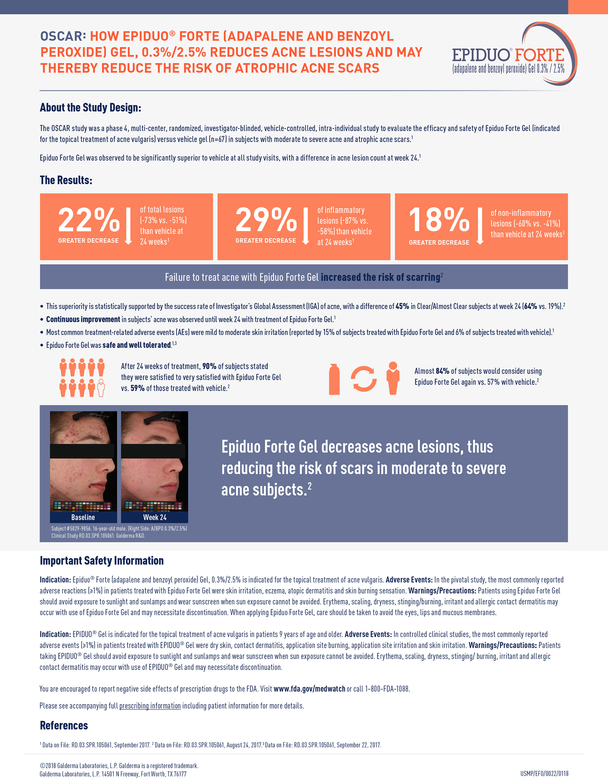 “We are pleased to share these positive findings that underscore the efficacy and tolerability of Epiduo Forte Gel in the treatment of acne,”1,13 said Chris Chapman, Vice President and General Manager of Galderma’s U.S. Prescription Business. "We hope that the learnings from the OSCAR study will help empower clinicians to view scar risk reduction as a key consideration within the acne treatment paradigm.”1,6