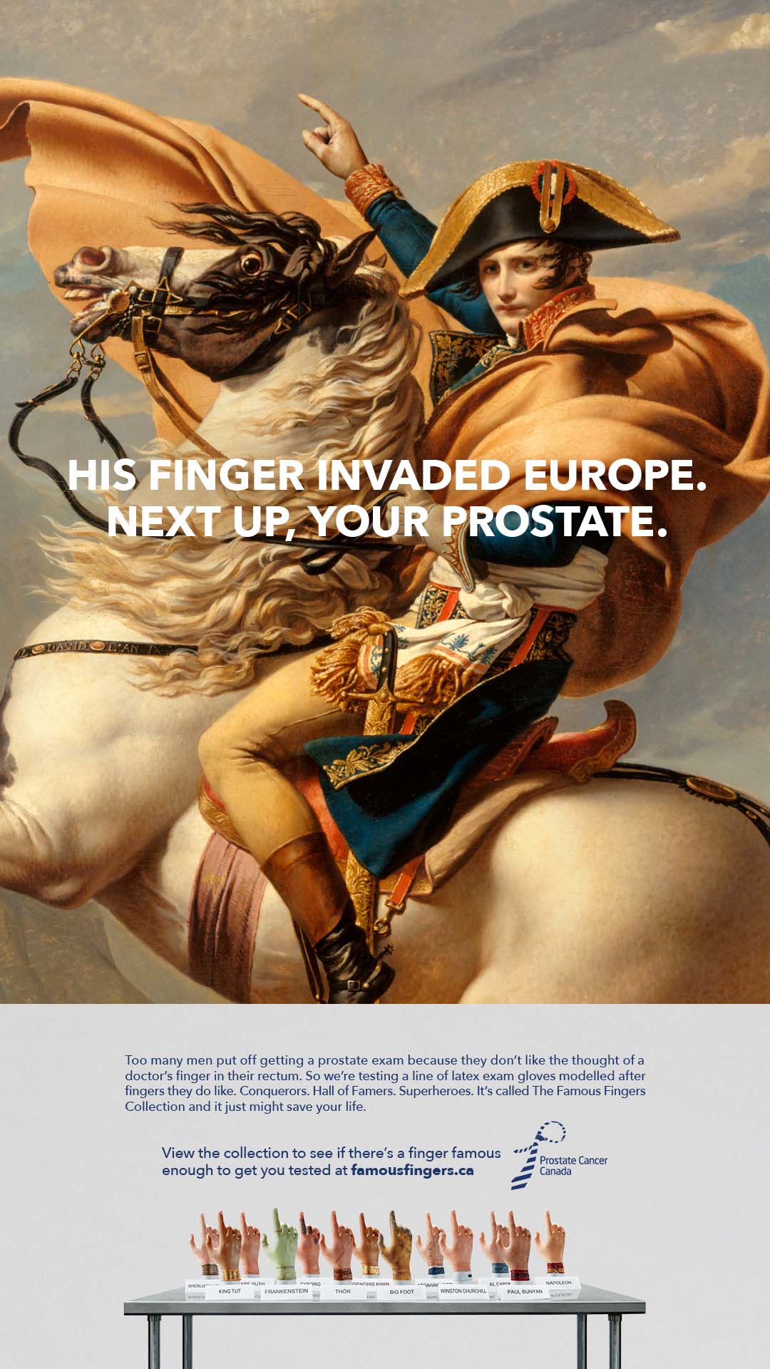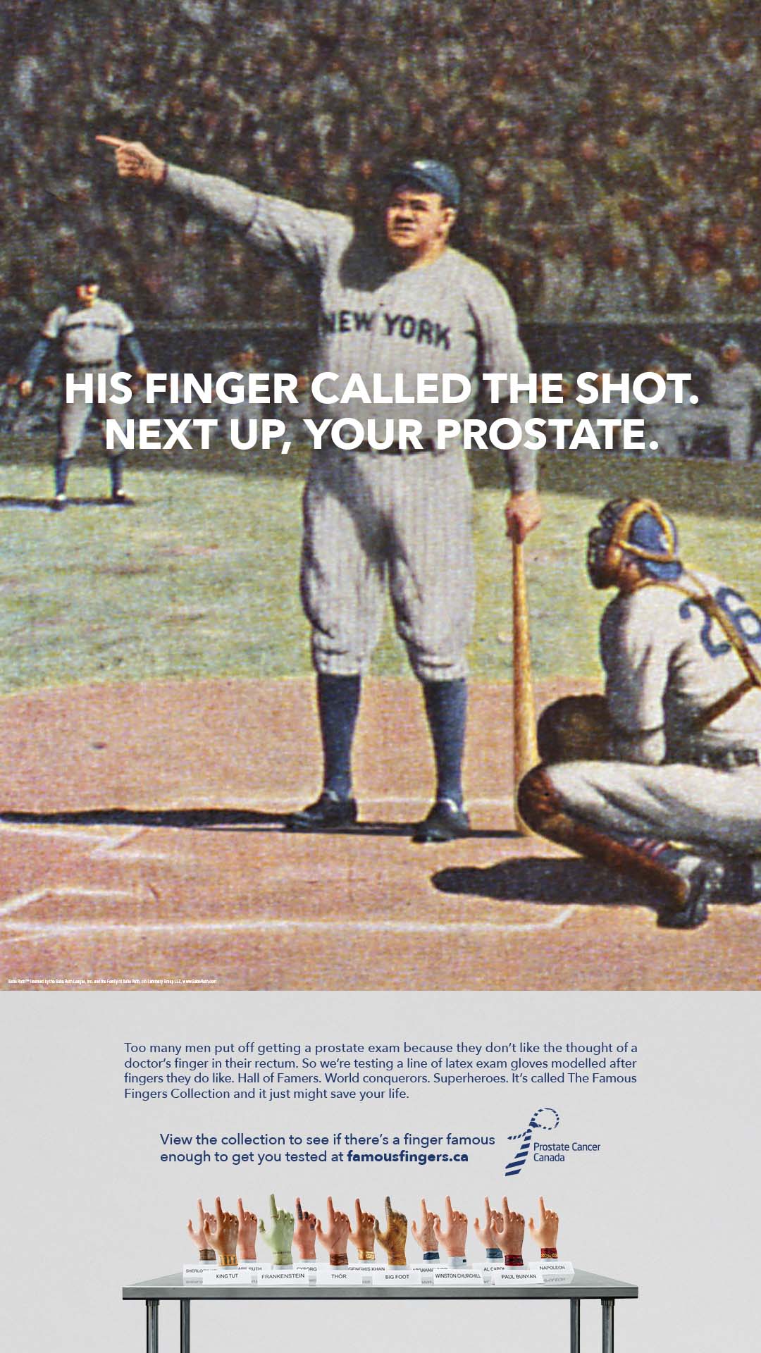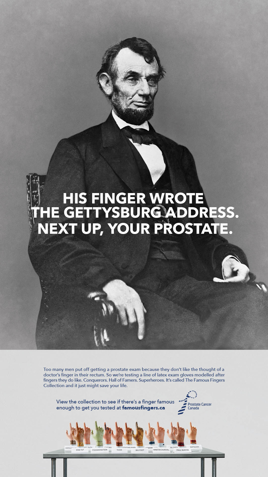 In order to raise awareness and encourage men to get checked Prostate Cancer Canada is testing the Famous Fingers Collection (a line of latex gloves) modeled after famous fingers to research which men prefer. Famous Fingers like that of Babe Ruth, Otis Redding, Abraham Lincoln, or others. The collection can be viewed at famousfingers.ca and is designed to trigger a broader discussion around a serious topic that men traditionally prefer to avoid.