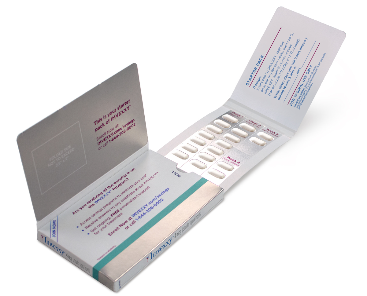 Imvexxy’s mechanism of action is the re-estrogenization of the tissue in and around the vagina. IMVEXXY’s distinctive formulation ensures that it dissolves completely without mess, so patients can use it any time of day by placing the softgel capsule in the lower part of the vagina to treat the vulva and vagina. IMVEXXY is administered daily for two weeks followed by only twice a week dosing. Nine out of 10 patients who participated in a clinical trial reported that IMVEXXY was “easy to use.”4