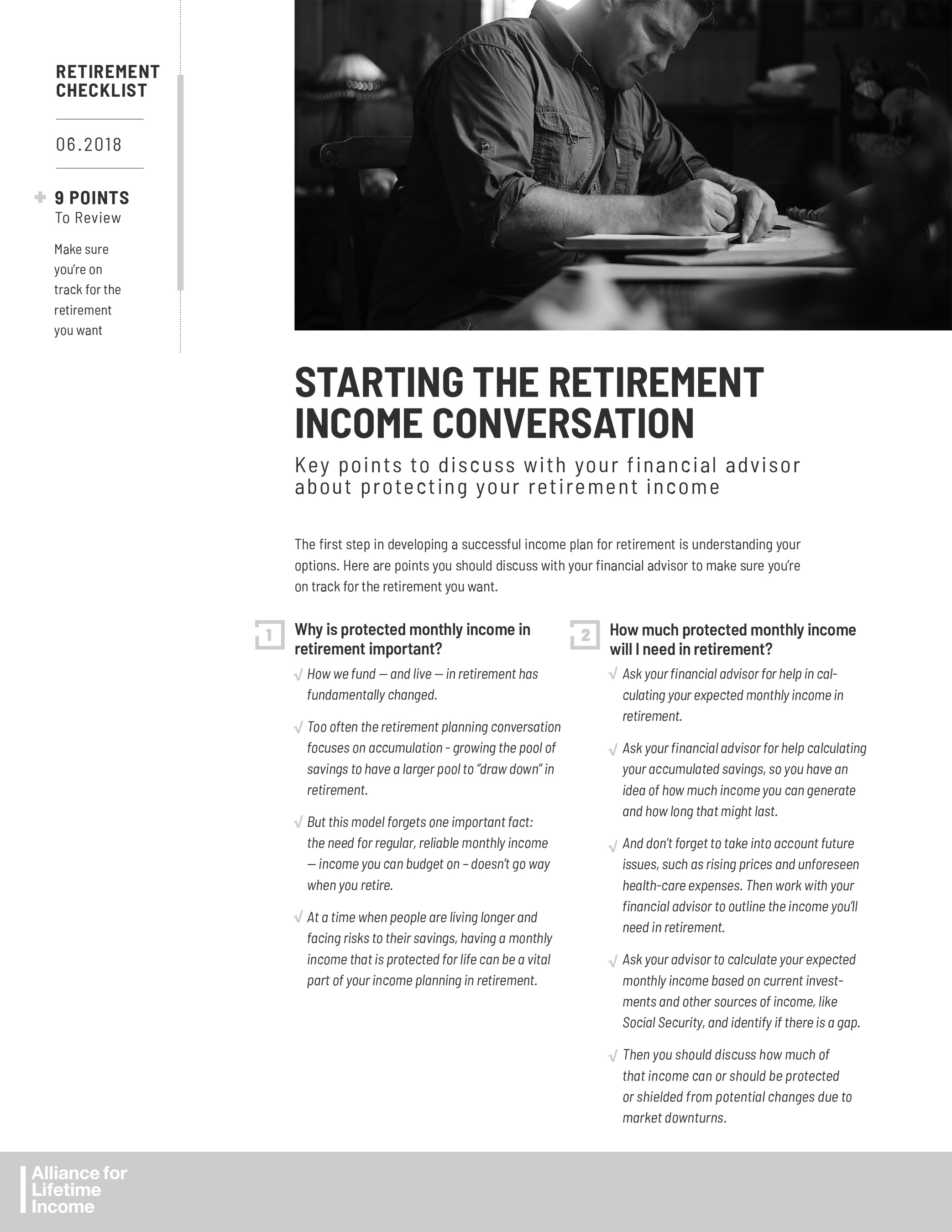 To begin changing the retirement planning conversation and help solve the problem of too many American households lacking protected retirement income, 24 financial services organizations launched the Alliance for Lifetime Income. The Alliance’s mission is to educate Americans about the importance of protected lifetime income solutions by building a platform of new online and offline content, tools, thought leadership, events, and new terminology designed to simplify this often complex topic in ways that empower Americans to take action.
